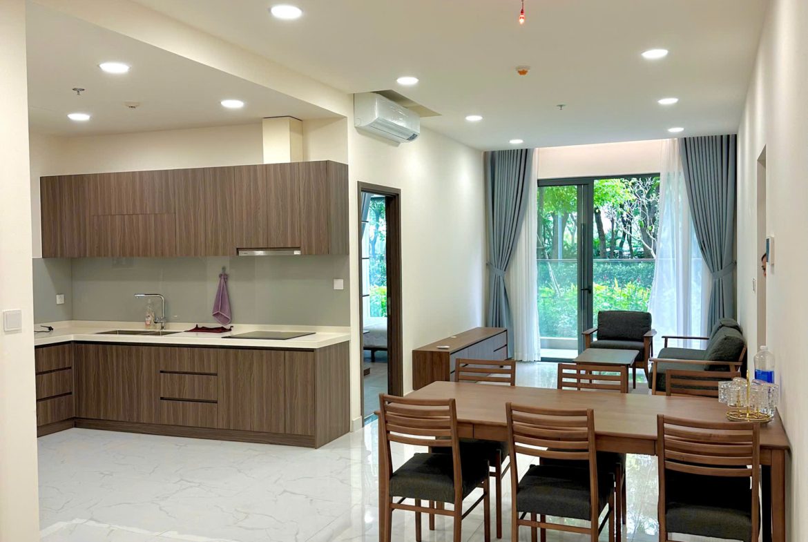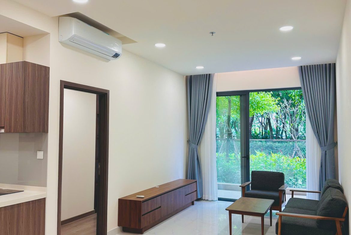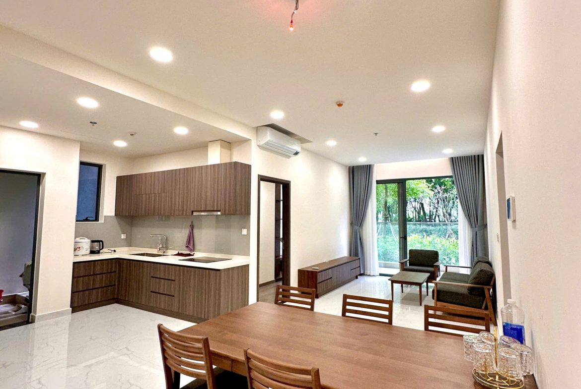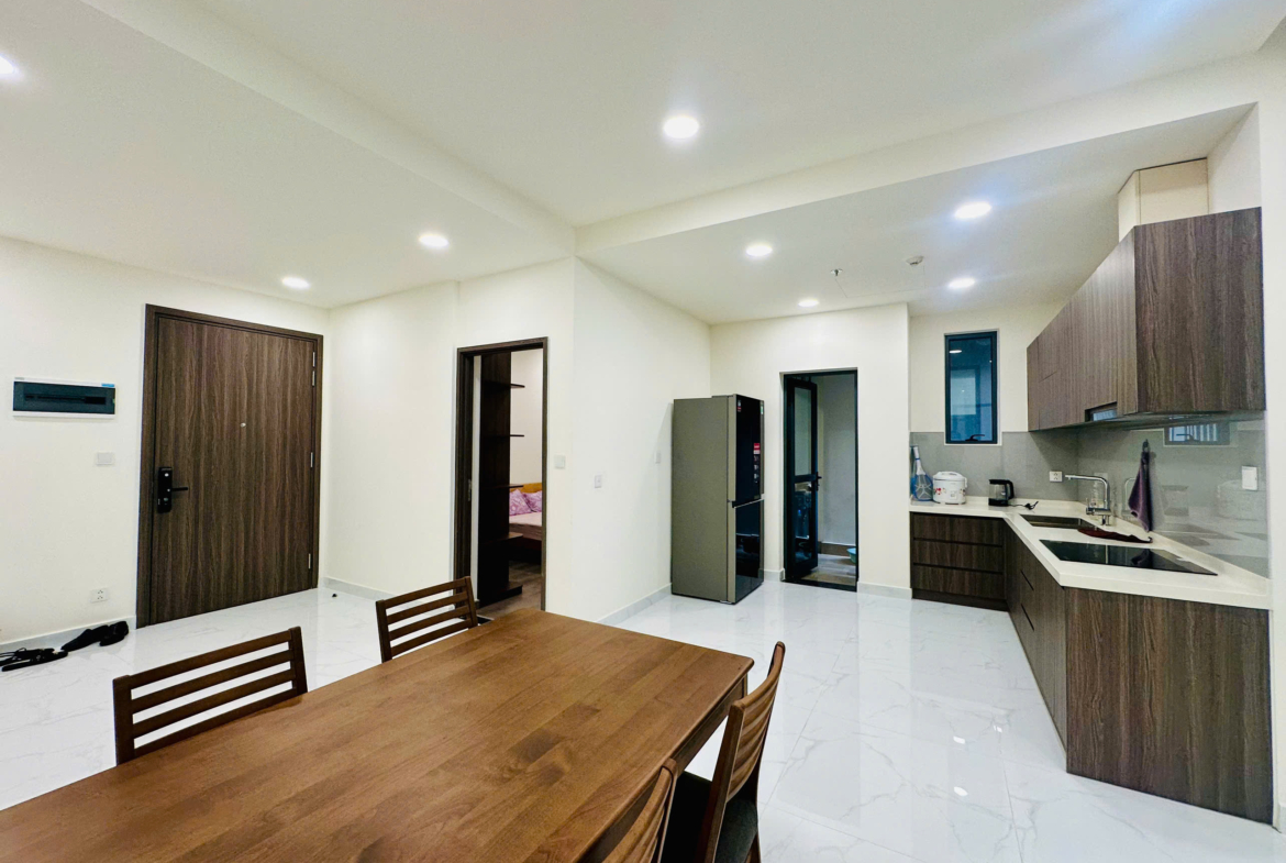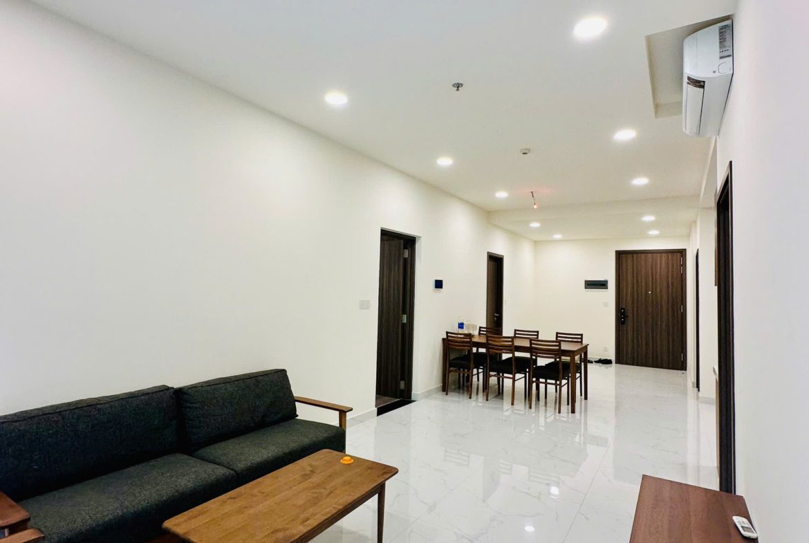 Căn hộ đã được trang bị đầy đủ nội thất: Sofa, bàn trà, bàn ăn, giường ngủ, tủ quần áo, tủ bếp, bếp điện từ, điều hòa, máy nước nóng, tủ giày, rèm cửa, giàn phơi đồ, máy giặt, tivi, kệ tivi, tủ giày…