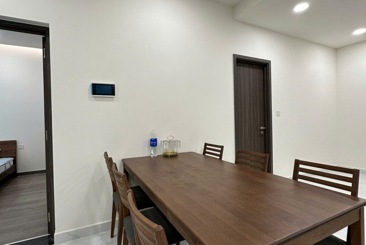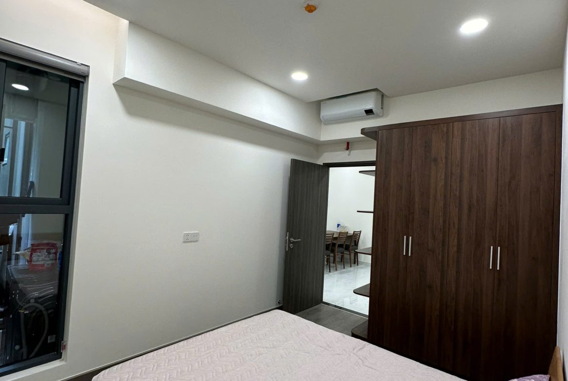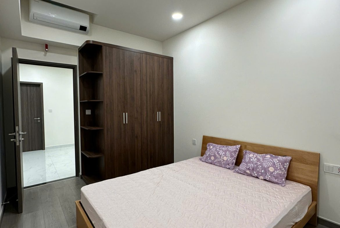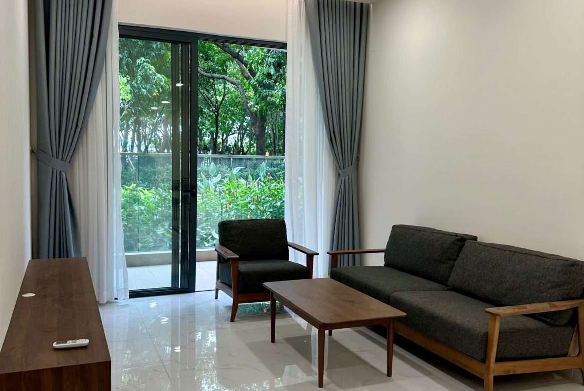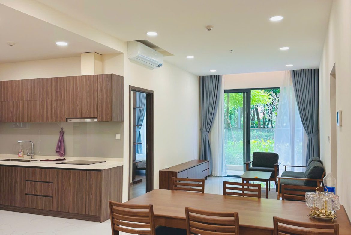 Căn hộ đã được trang bị đầy đủ nội thất: Sofa, bàn trà, bàn ăn, giường ngủ, tủ quần áo, tủ bếp, bếp điện từ, điều hòa, máy nước nóng, tủ giày, rèm cửa, giàn phơi đồ, máy giặt, tivi, kệ tivi, tủ giày…